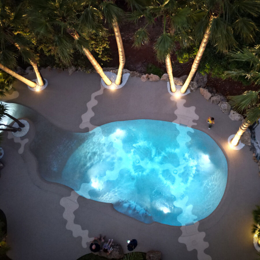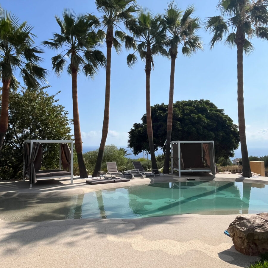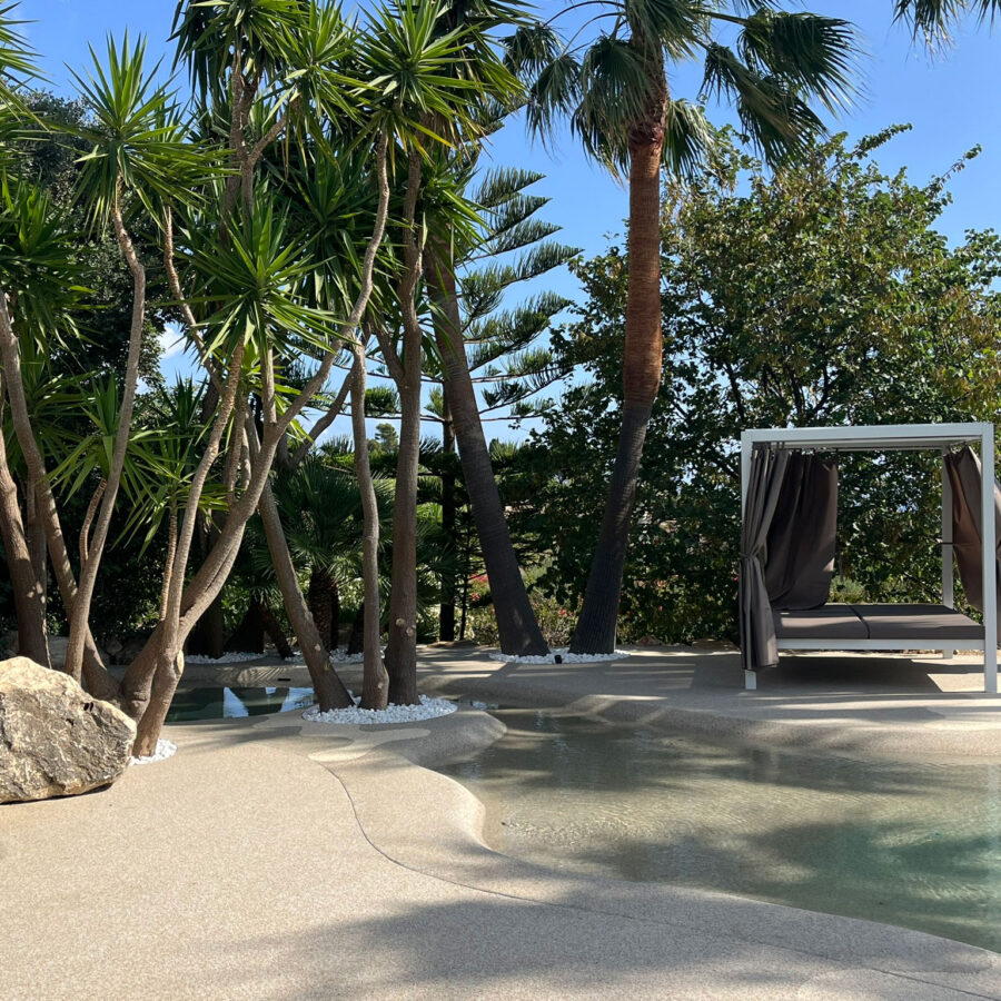Un’oasi di relax dalle forme organiche e sinuose, incorniciata da palme svettanti e da un panorama mozzafiato, che regala momenti di pura quiete immersi nella bellezza del paesaggio.