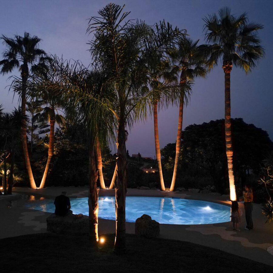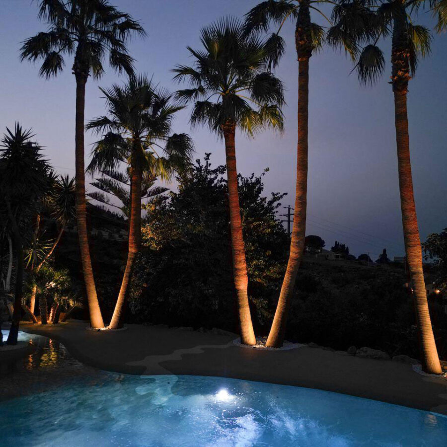 Al calar della sera, un’illuminazione sapientemente studiata trasforma il giardino e la piscina in un scenario suggestivo e surreale, esaltando i colori del verde e il luccichio dell’acqua in un’atmosfera magica.