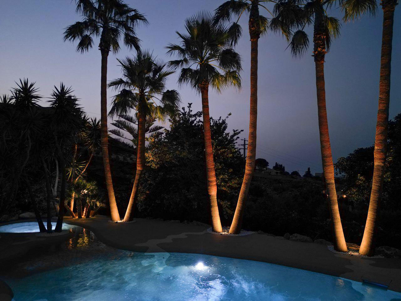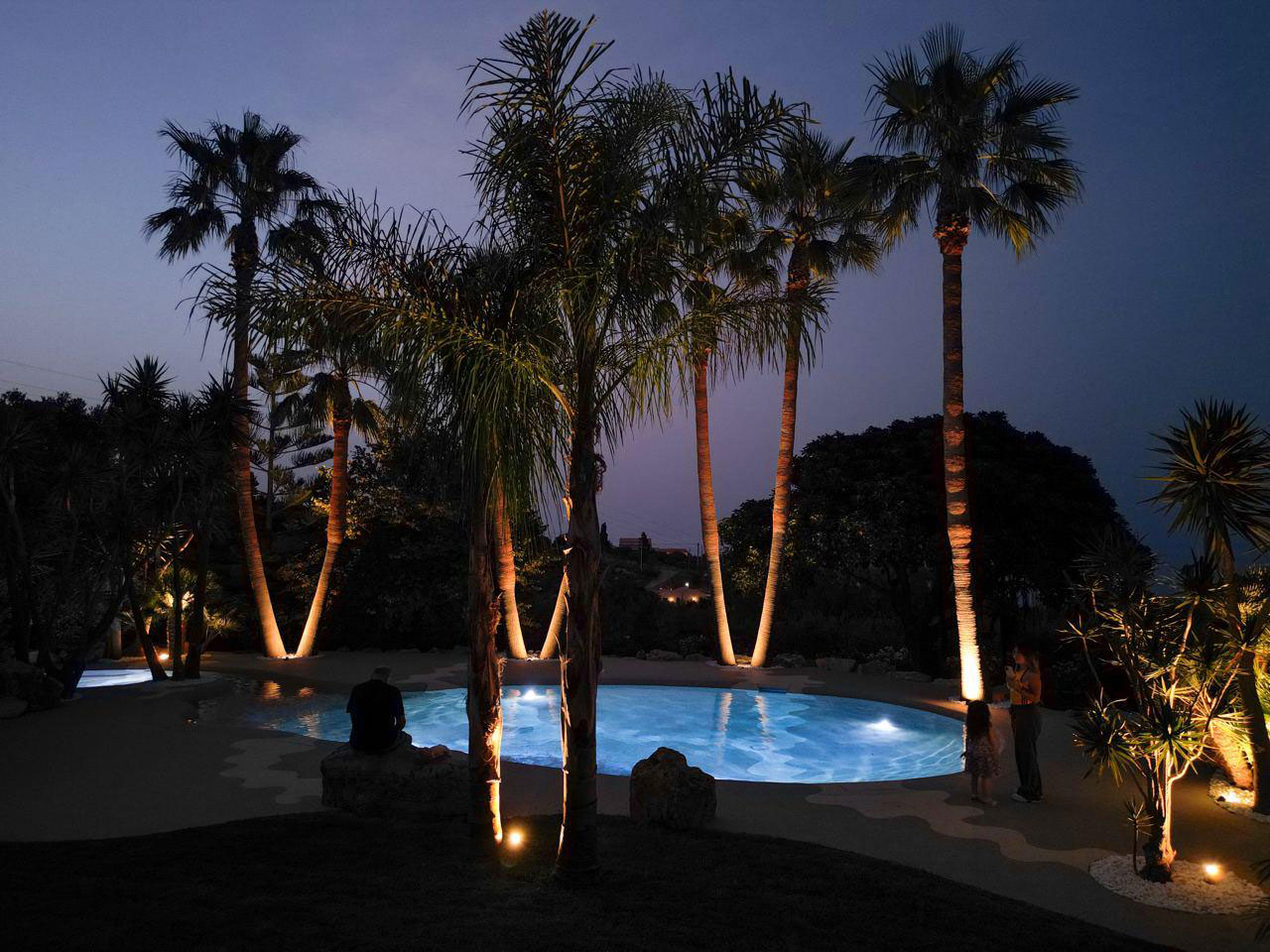 Al calar della sera, un’illuminazione sapientemente studiata trasforma il giardino e la piscina in un scenario suggestivo e surreale, esaltando i colori del verde e il luccichio dell’acqua in un’atmosfera magica.