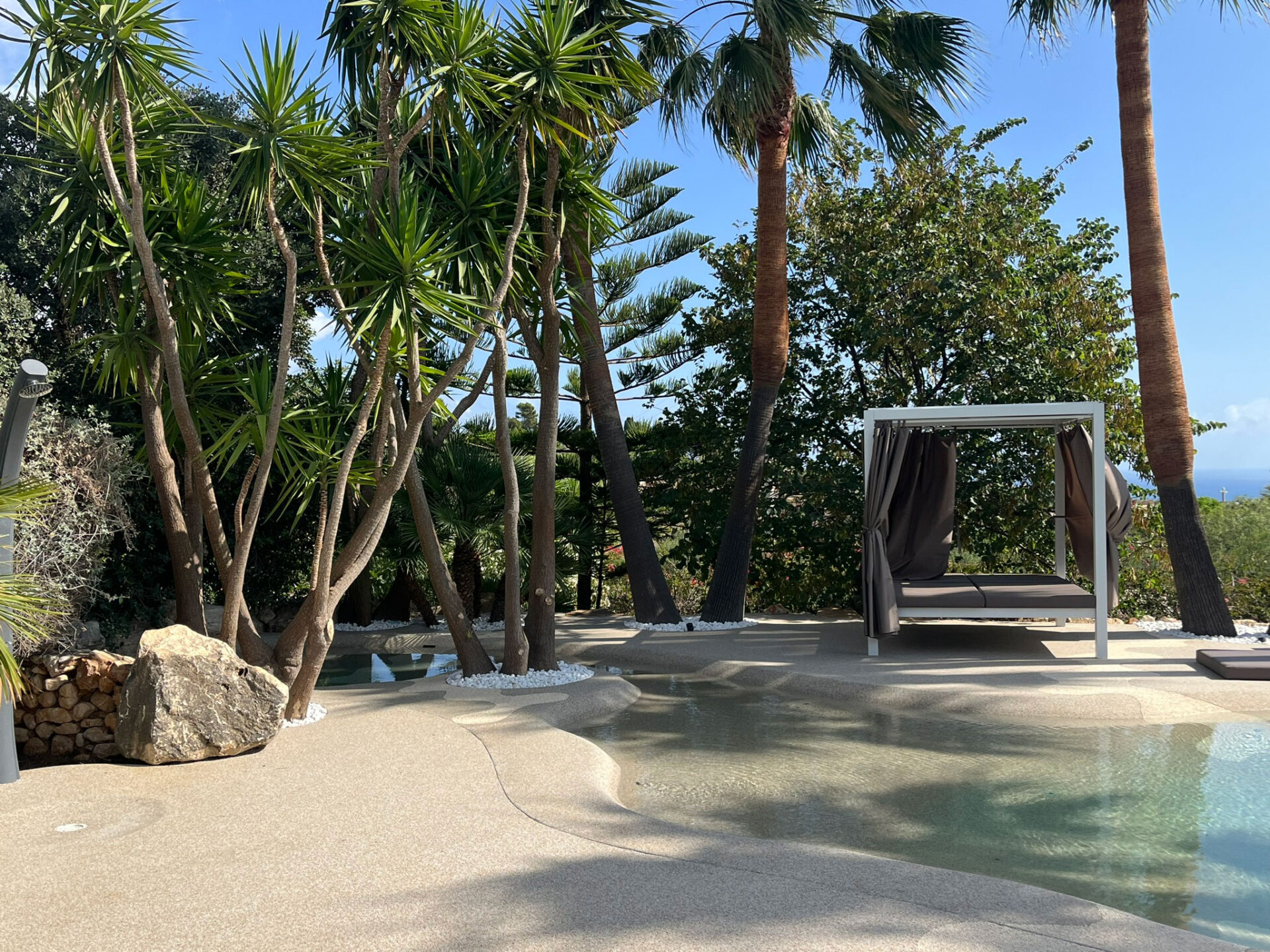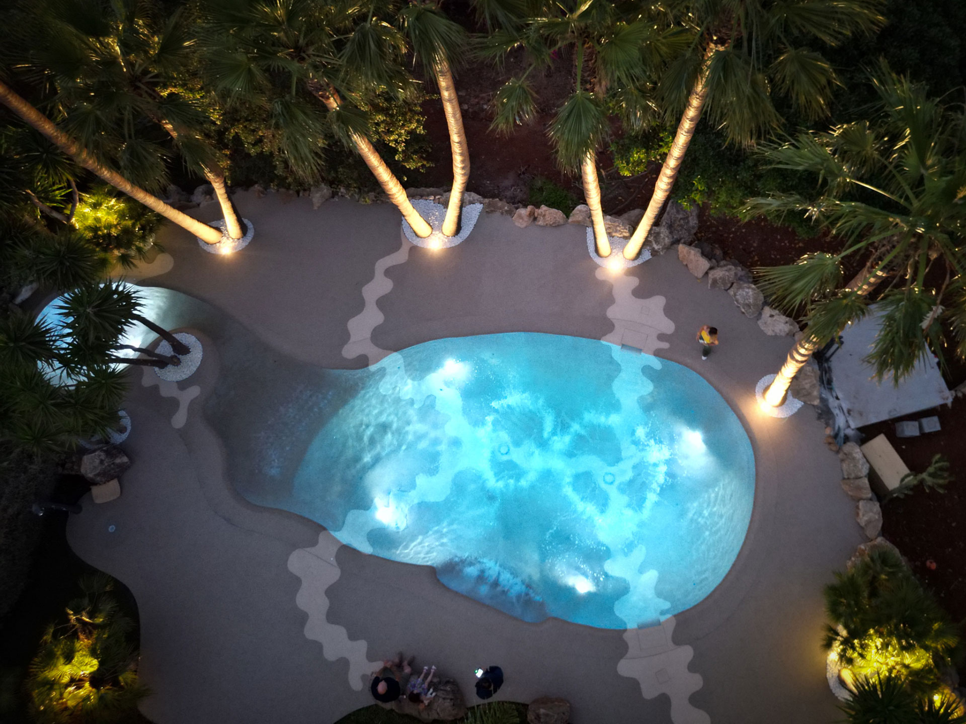 La piscina privata, dalla forma irregolare, è un autentico capolavoro ecocompatibile che integra elementi naturali come rocce e vegetazione nel suo design.