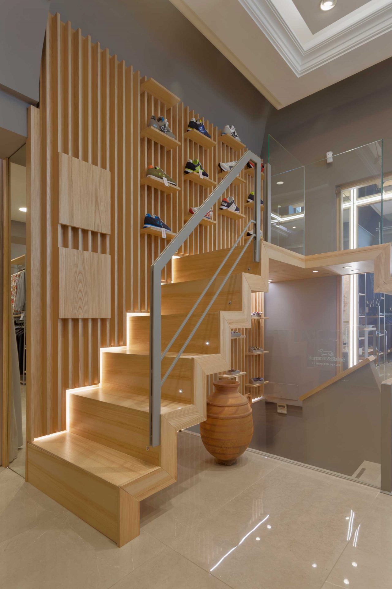 Il progetto lega i quattro ambienti con una linea di mobili espositori disegnati e realizzati su misura con strutture in metallo verniciato grigio seta e ripiani essenze di legno a richiamare il marchio in maniera stilizzata. Tutte le pareti sono di vellutato color grigio tale da risaltare i prodotti esposti. La monumentale cassa all’ingresso contrasta con la sua linearità e minimalismo con lo sfondo particolare in carta da parati quasi di belle époque ritrovata. La cura della luce, elemento fondamentale per l’esposizione, ha fatto sì che ogni angolo susciti emozione.
