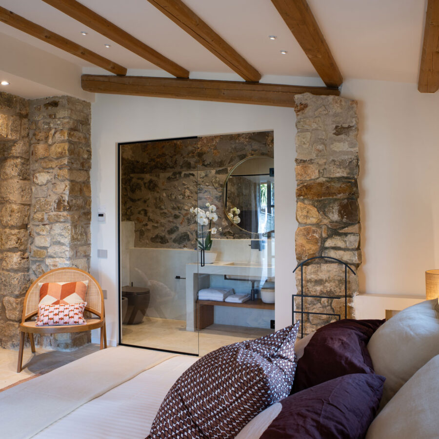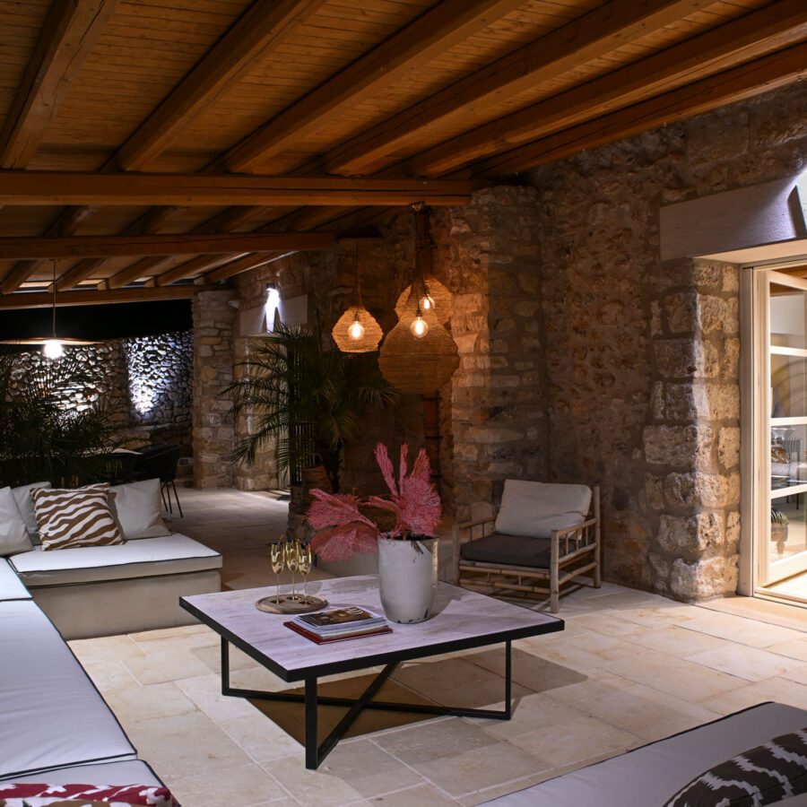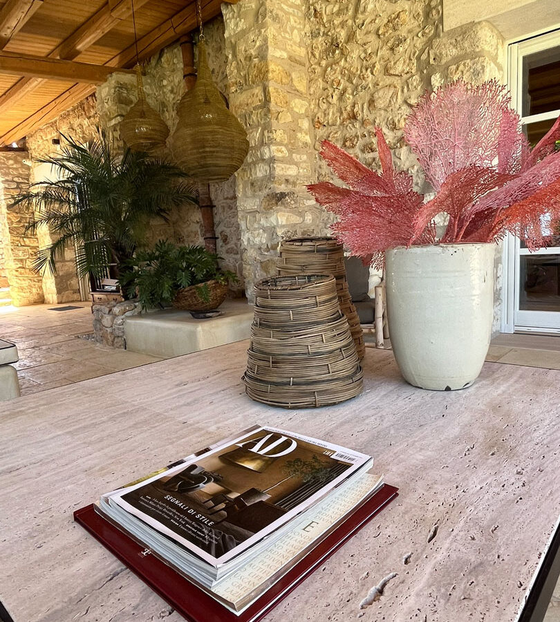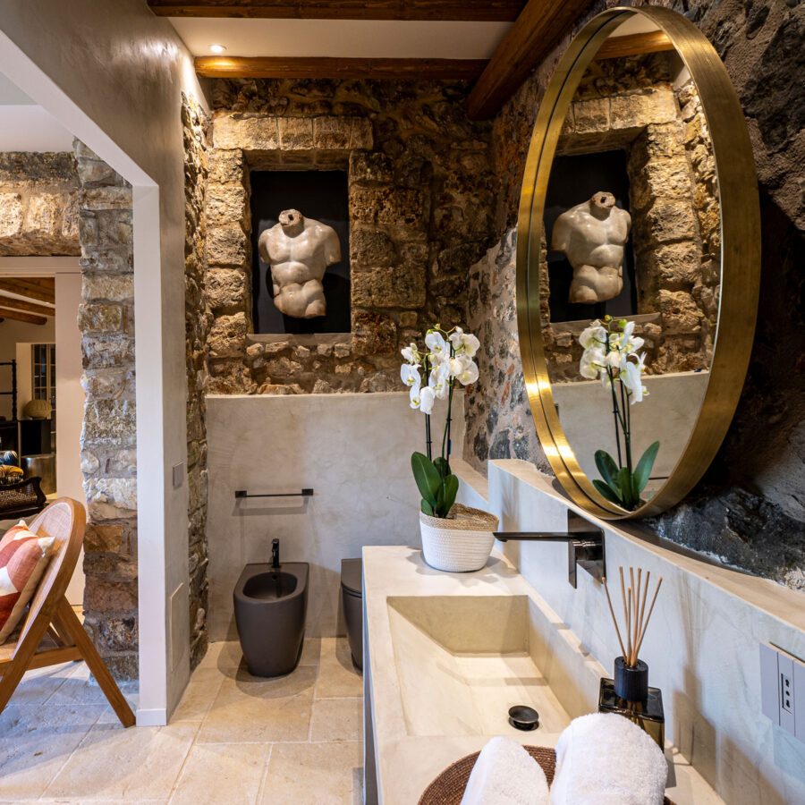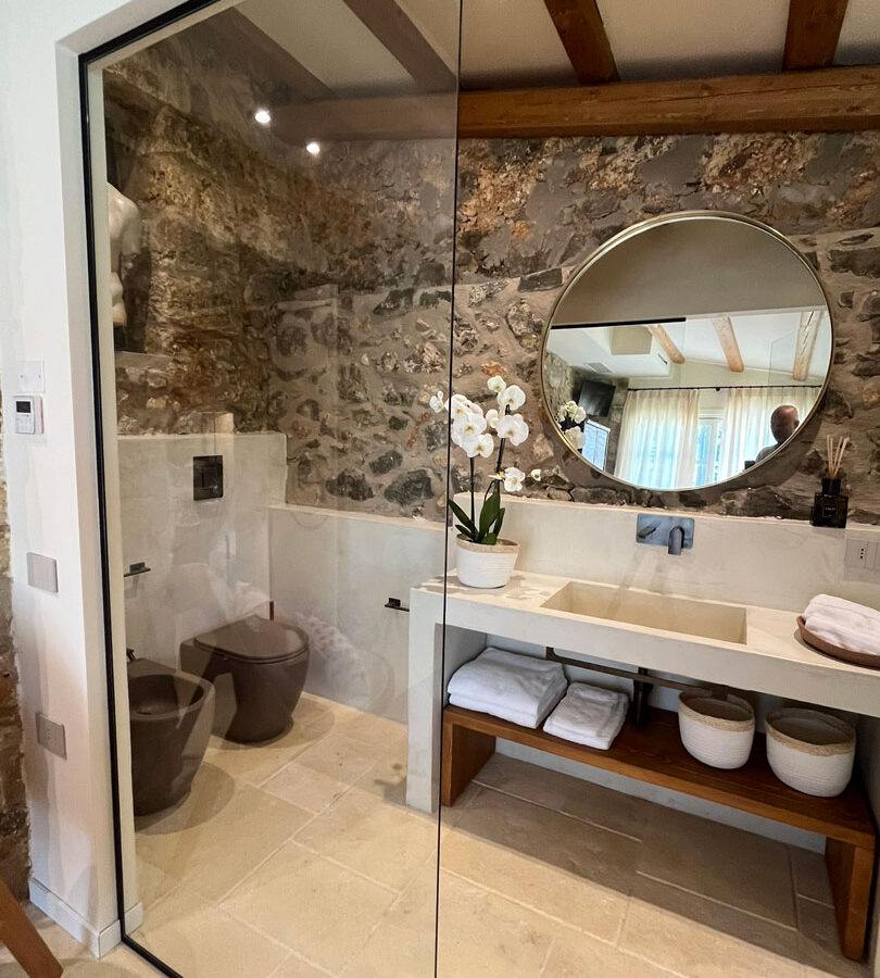 I pavimenti in pietra, i tessuti naturali, le tonalità terrose e il design equilibrato restituiscono un senso di armonia e continuità con il contesto naturale.