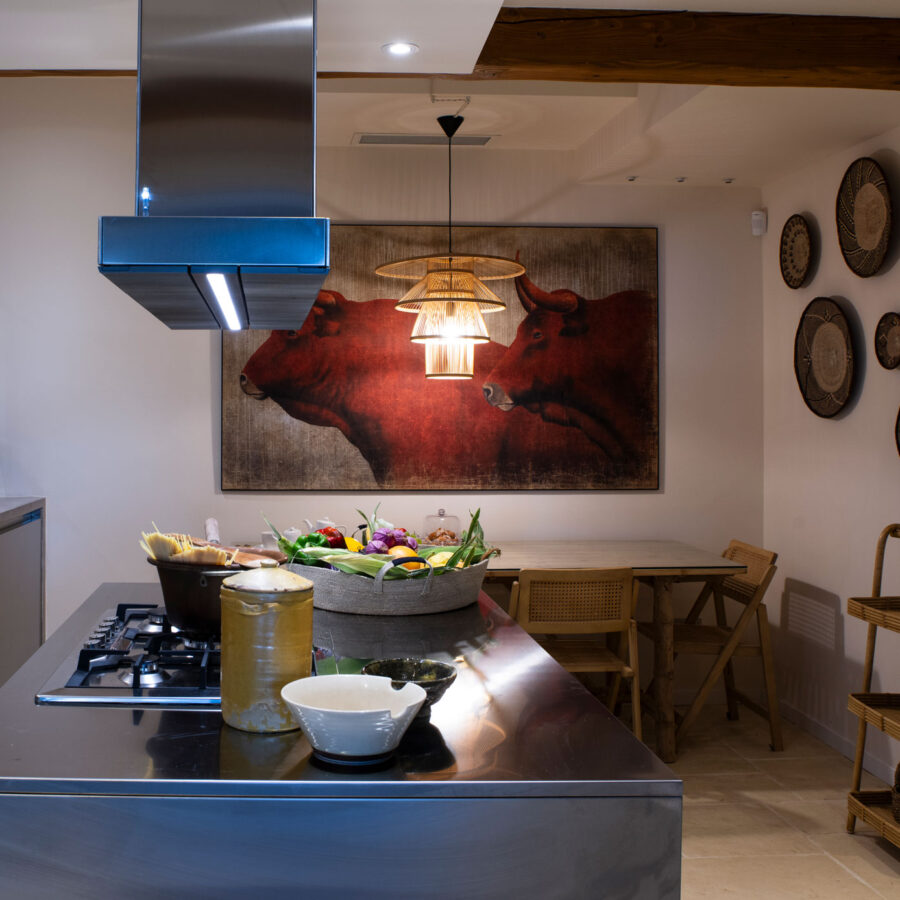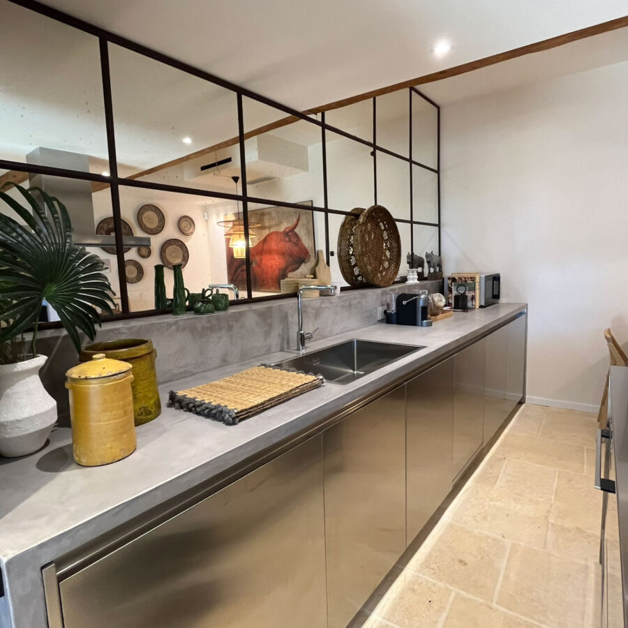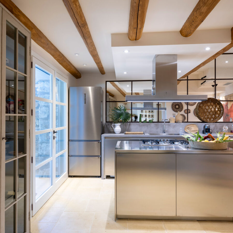 La cucina, vero cuore della casa, è realizzata interamente in acciaio con linee minimaliste, e dialoga elegantemente con una parete in specchio antichizzato incorniciata da profili in ferro corten. Il tutto è completato da un tavolo e sedie in stile safari, in perfetta sintonia con lo spirito della villa.