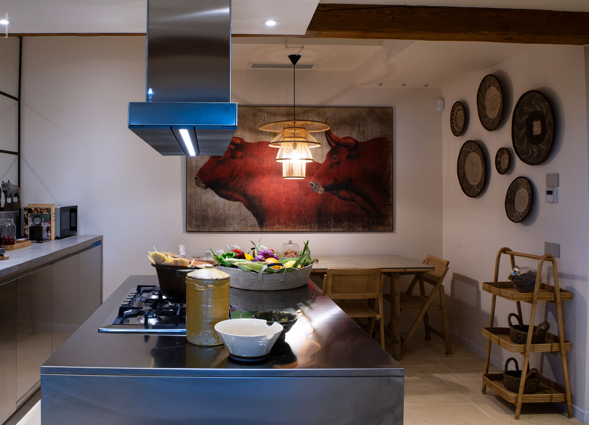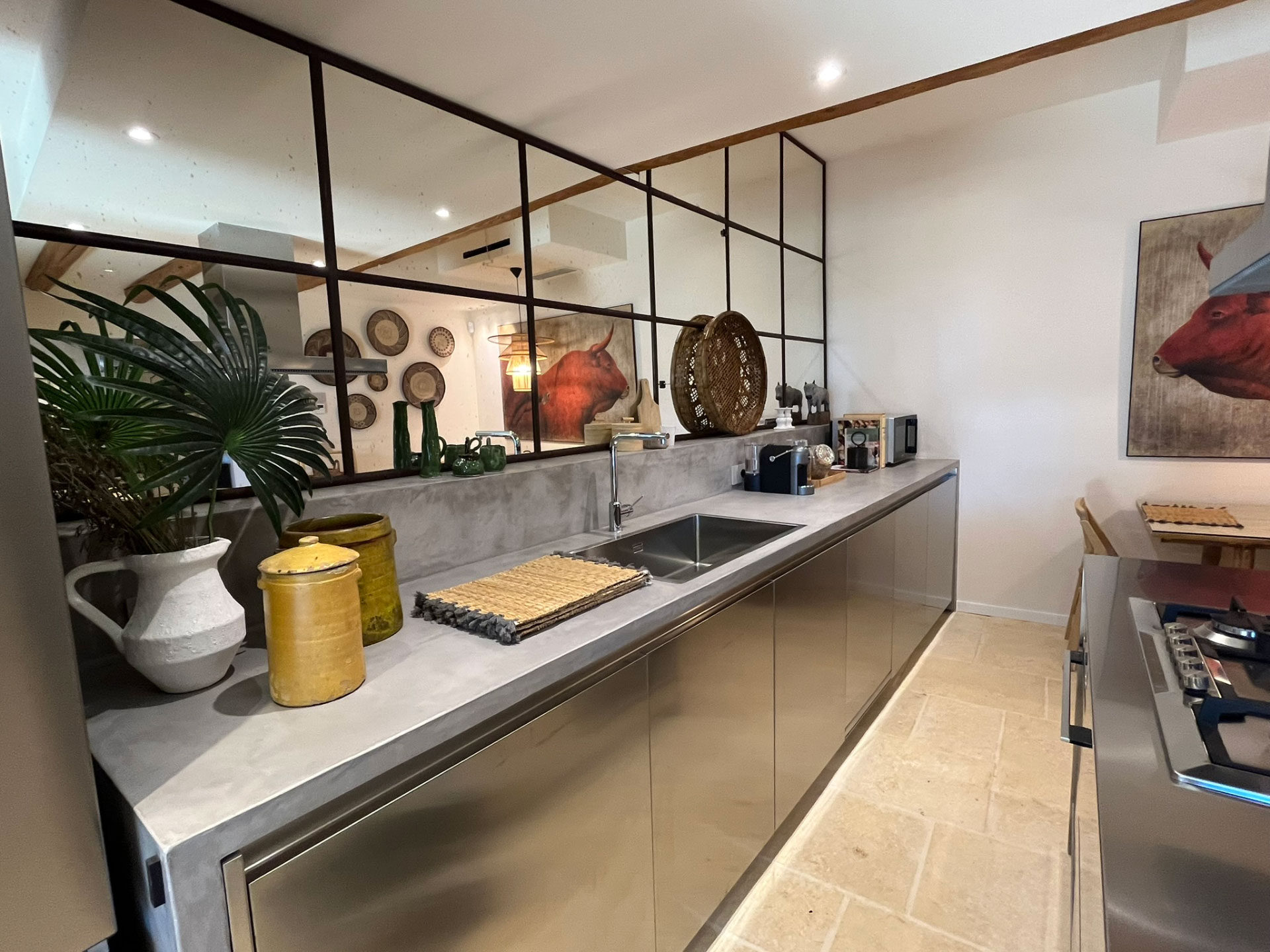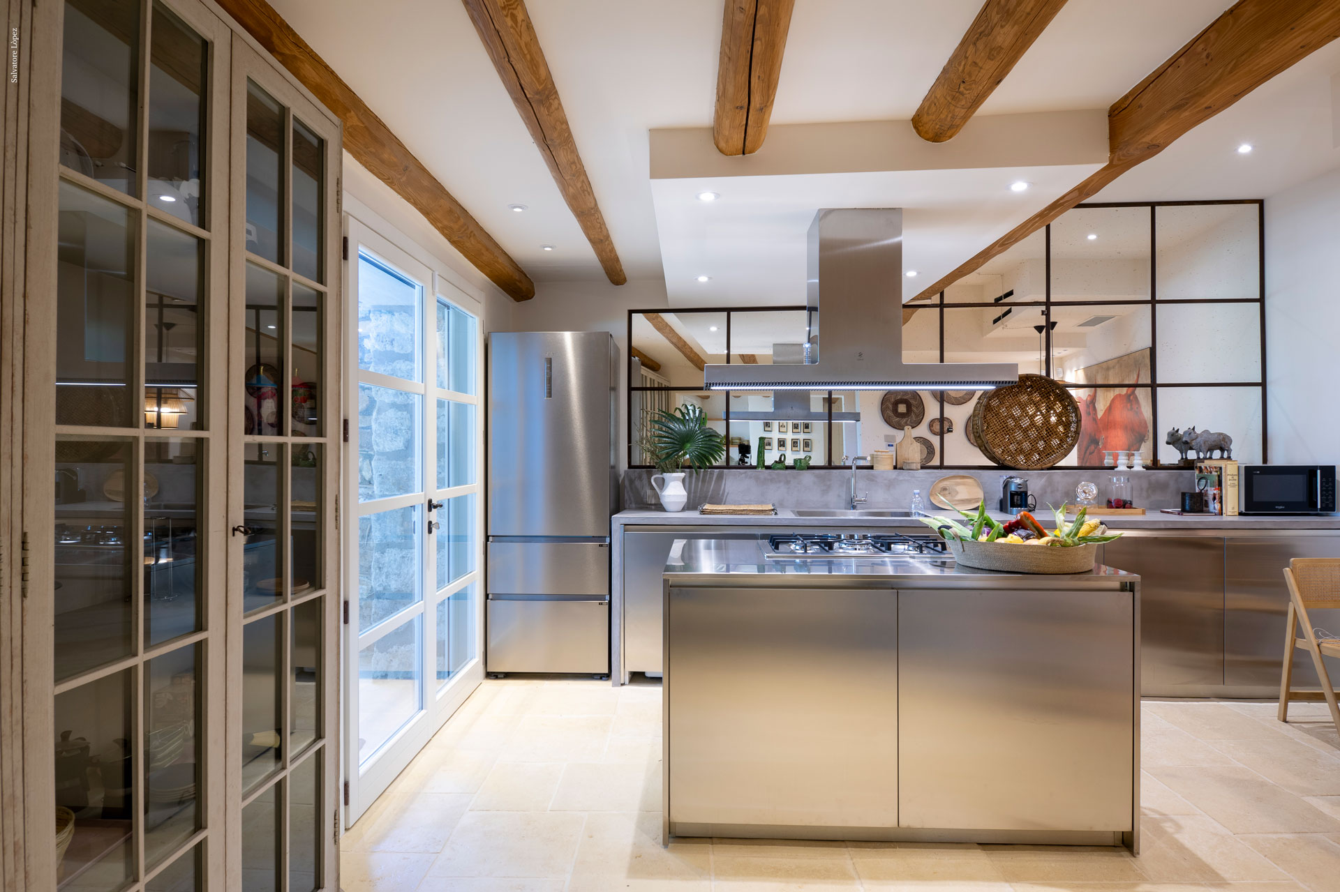 La cucina, vero cuore della casa, è realizzata interamente in acciaio con linee minimaliste, e dialoga elegantemente con una parete in specchio antichizzato incorniciata da profili in ferro corten. Il tutto è completato da un tavolo e sedie in stile safari, in perfetta sintonia con lo spirito della villa.