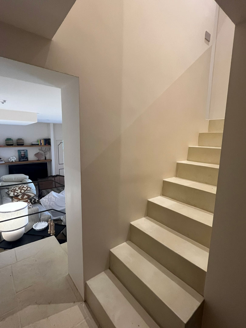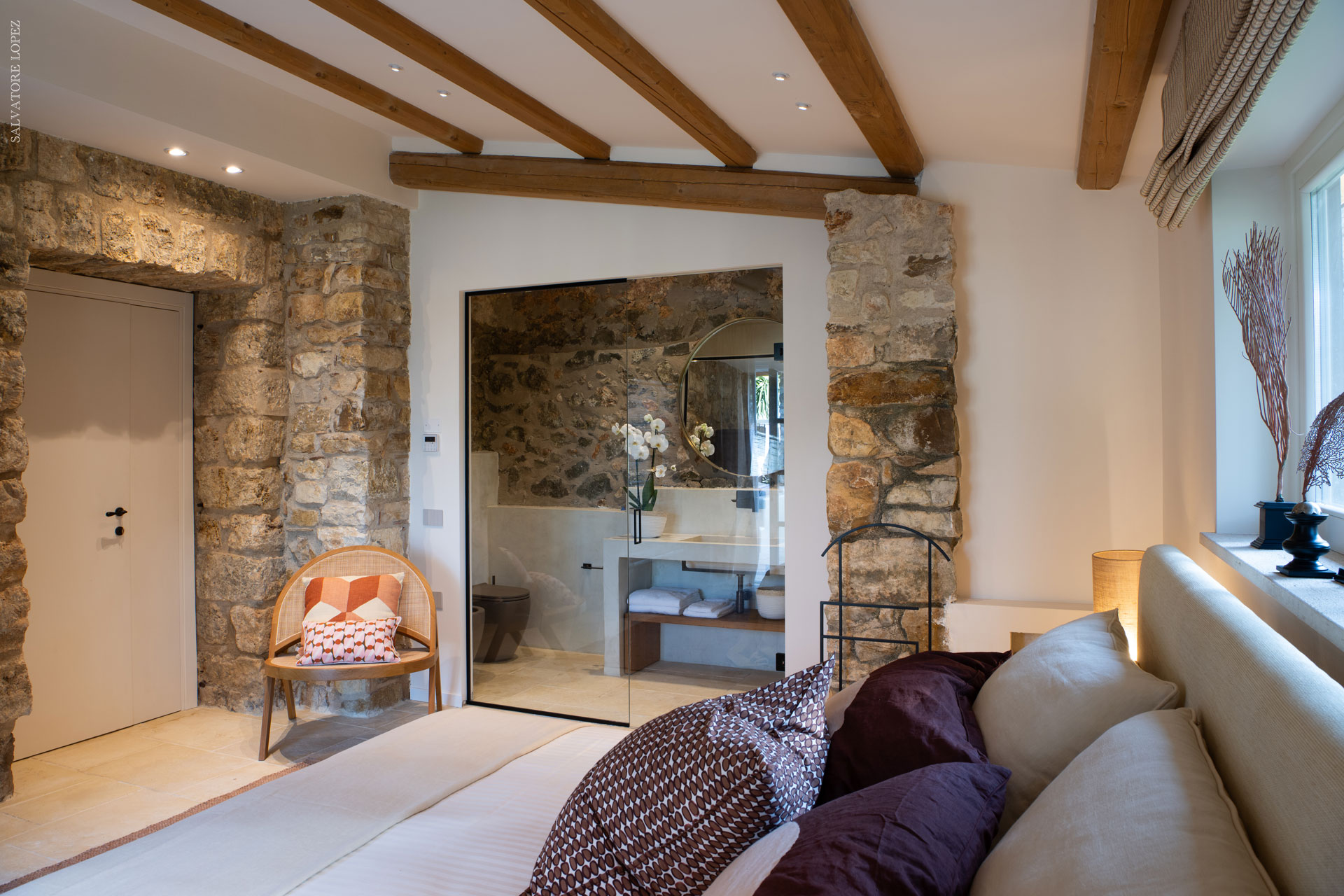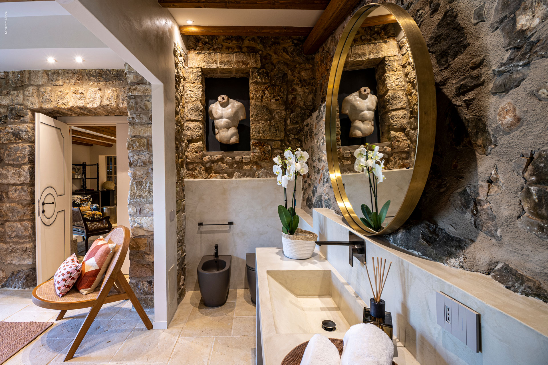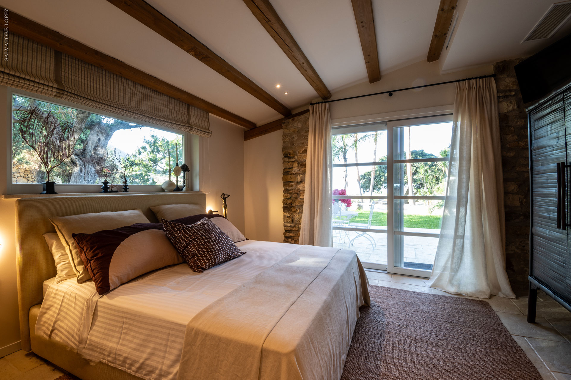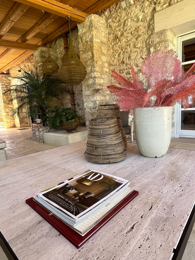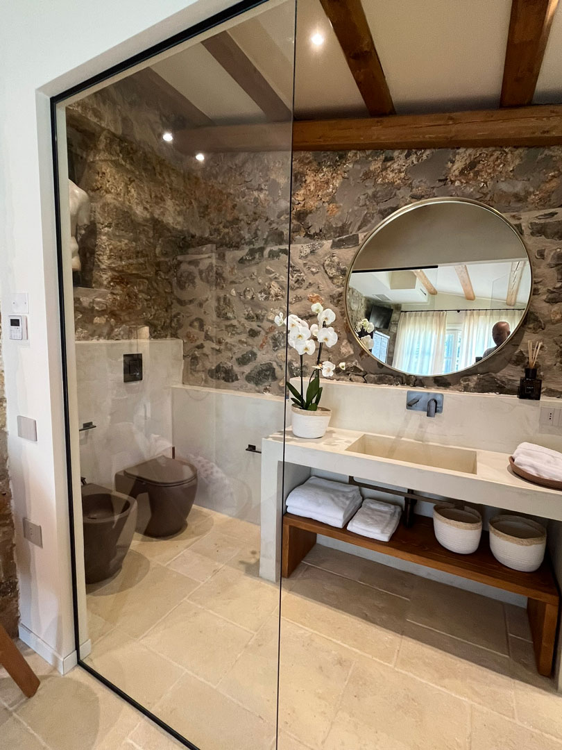 I pavimenti in pietra, i tessuti naturali, le tonalità terrose e il design equilibrato restituiscono un senso di armonia e continuità con il contesto naturale.