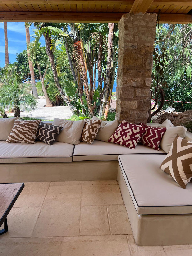 All’esterno, ampie verande arredate con sedute in muratura e complementi d’arredo su misura invitano al relax e alla convivialità, offrendo scorci suggestivi sul mare e sulla natura circostante.
