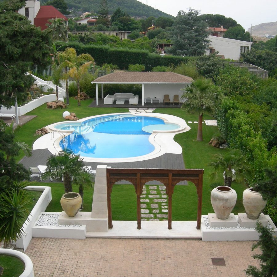 La piscina, di forma sinuosa e con tutto il necessario per il benessere, rompe e si contrappone alla rigidità delle linee dell’edificio creando un ambiente molto suggestivo, il colore blu spicca da ogni dove, attenta cura alla scelta dei materiali dalla pietra créme D’Algeri al tavolato di teak, ai corpi illuminanti nascosti nel prato, il portale indiano conferma lo stile e crea una quinta scenografica da oltrepassare.