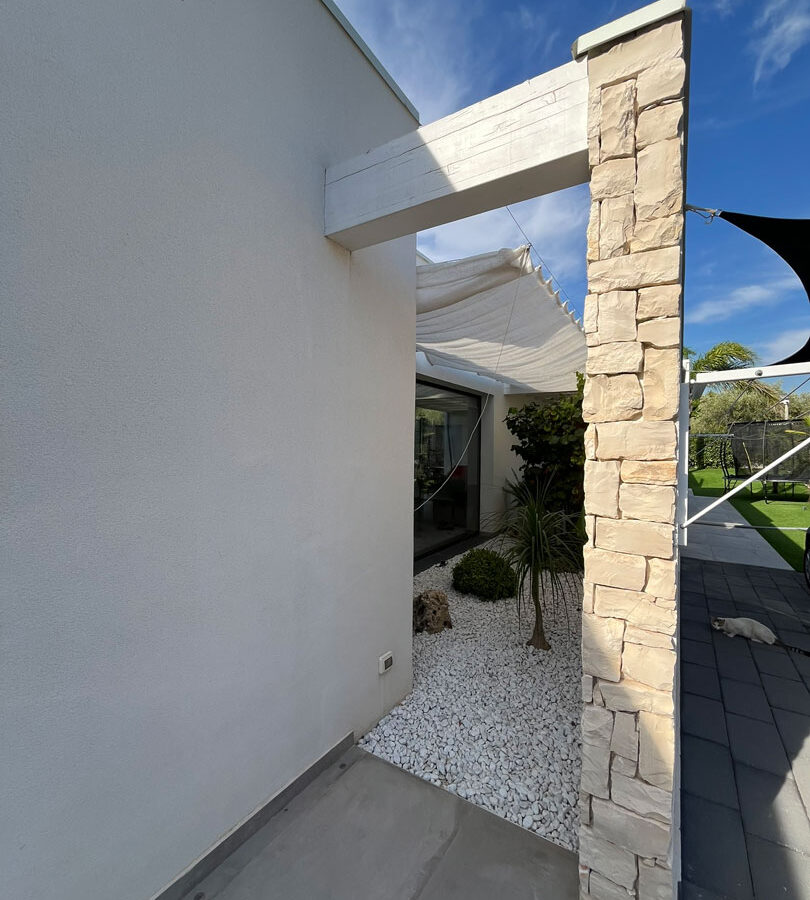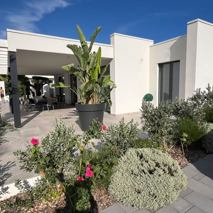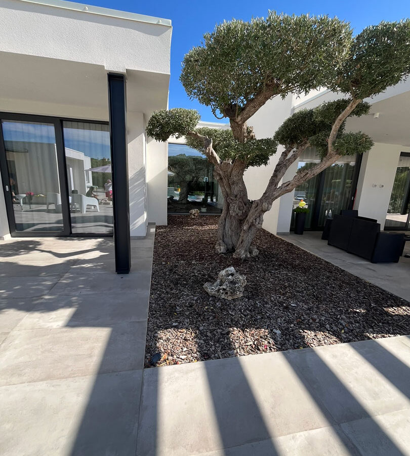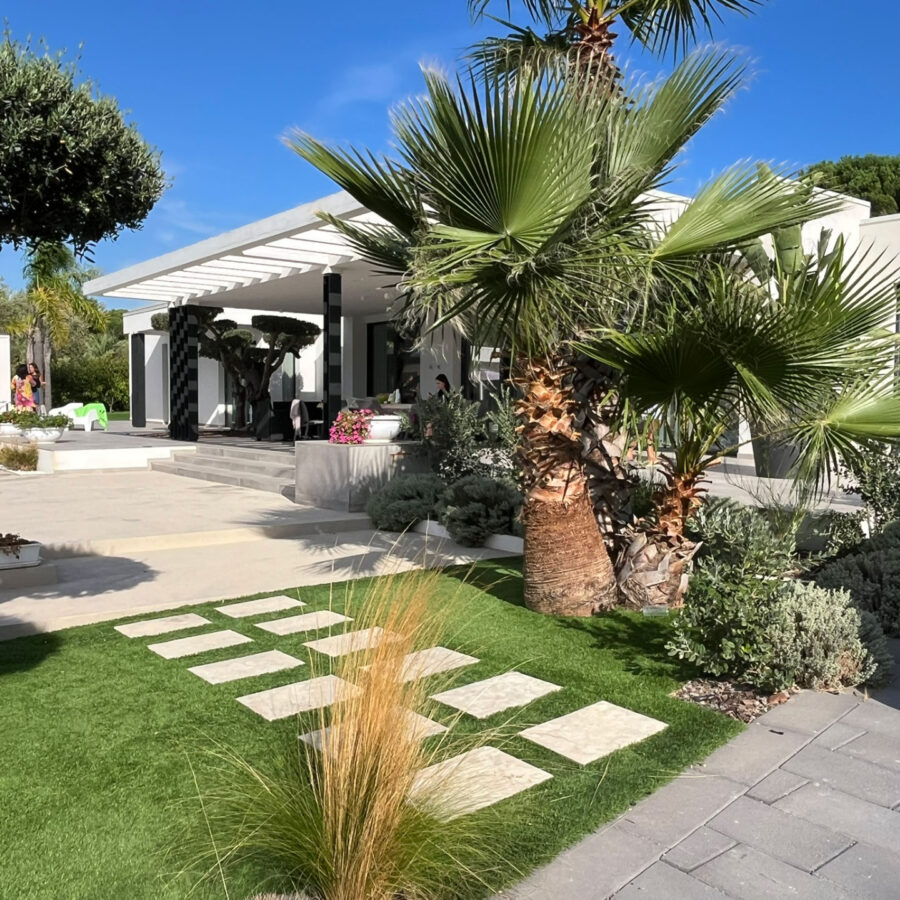 Il paesaggio mediterraneo entra in dialogo con l’architettura attraverso un’attenta selezione del verde: ulivi secolari, palme e piante ornamentali diventano elementi scultorei che arricchiscono il progetto, rafforzando la connessione con la natura.