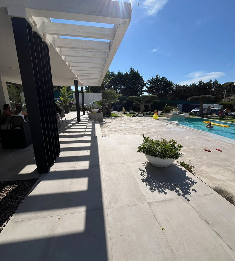 I pergolati in legno e acciaio disegnano ombre dinamiche che mutano durante il giorno, generando un gioco di luce e movimento che anima gli spazi esterni e ne sottolinea la geometria.