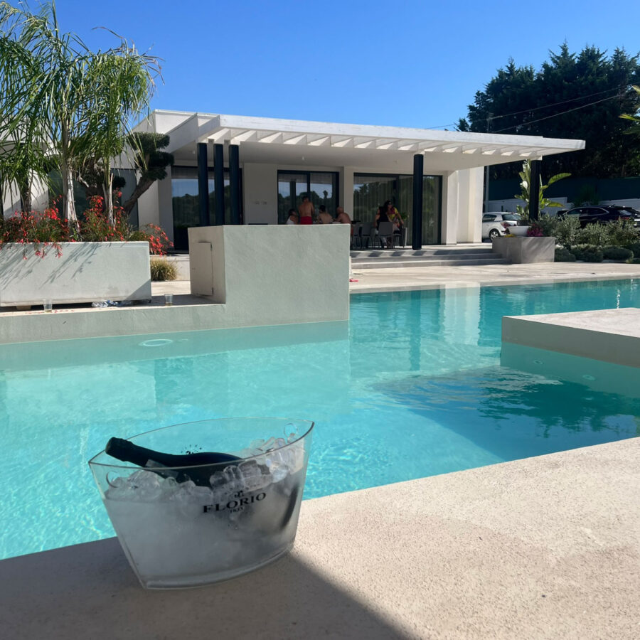Il corpo architettonico, caratterizzato da volumi netti e superfici bianche ed in pietra, si articola attorno alla piscina scenografica, fulcro visivo e percettivo dell’intero progetto.