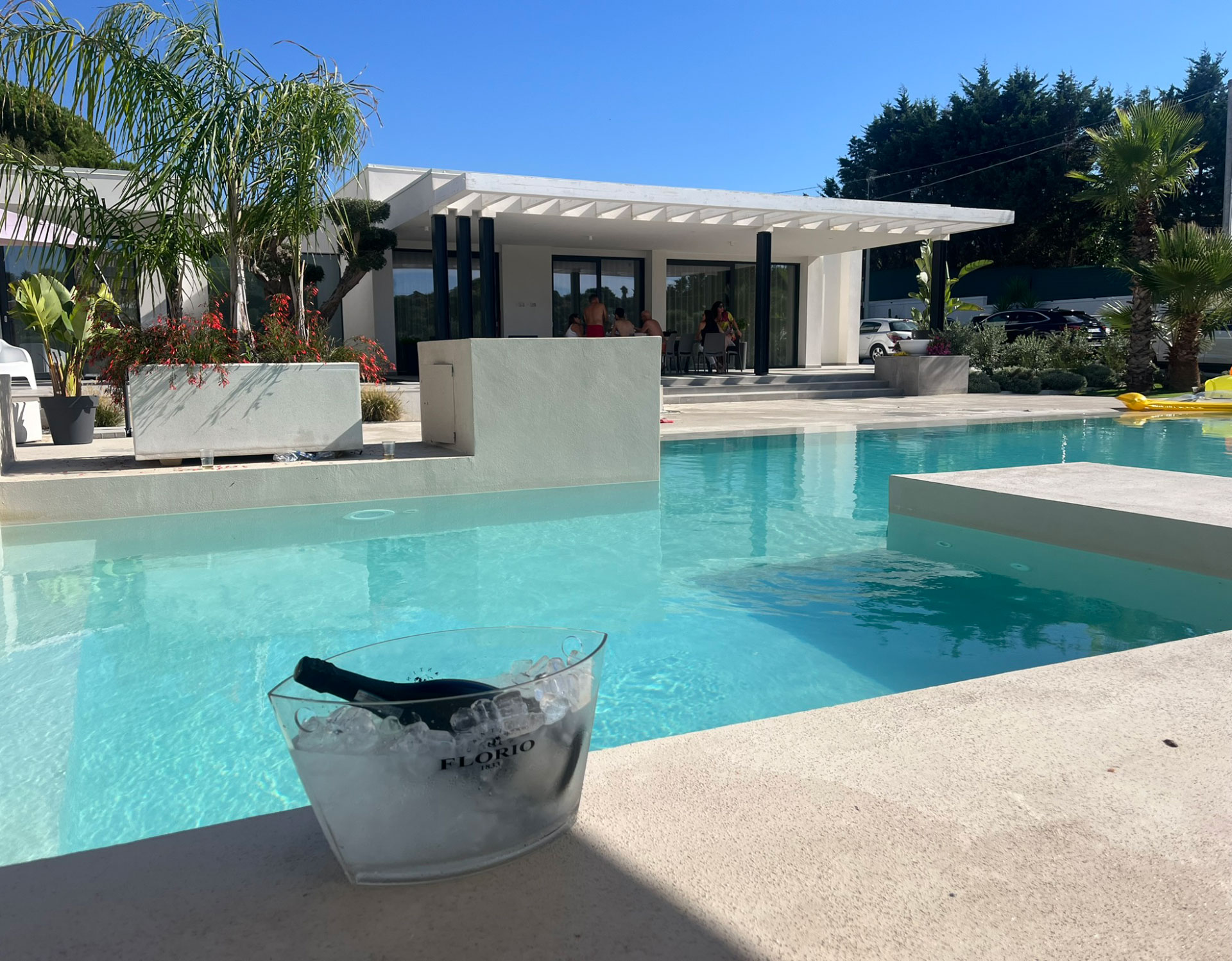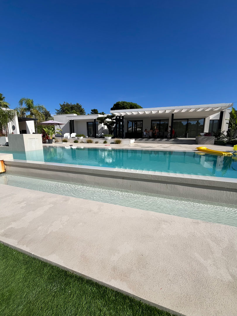 Il corpo architettonico, caratterizzato da volumi netti e superfici bianche ed in pietra, si articola attorno alla piscina scenografica, fulcro visivo e percettivo dell’intero progetto.