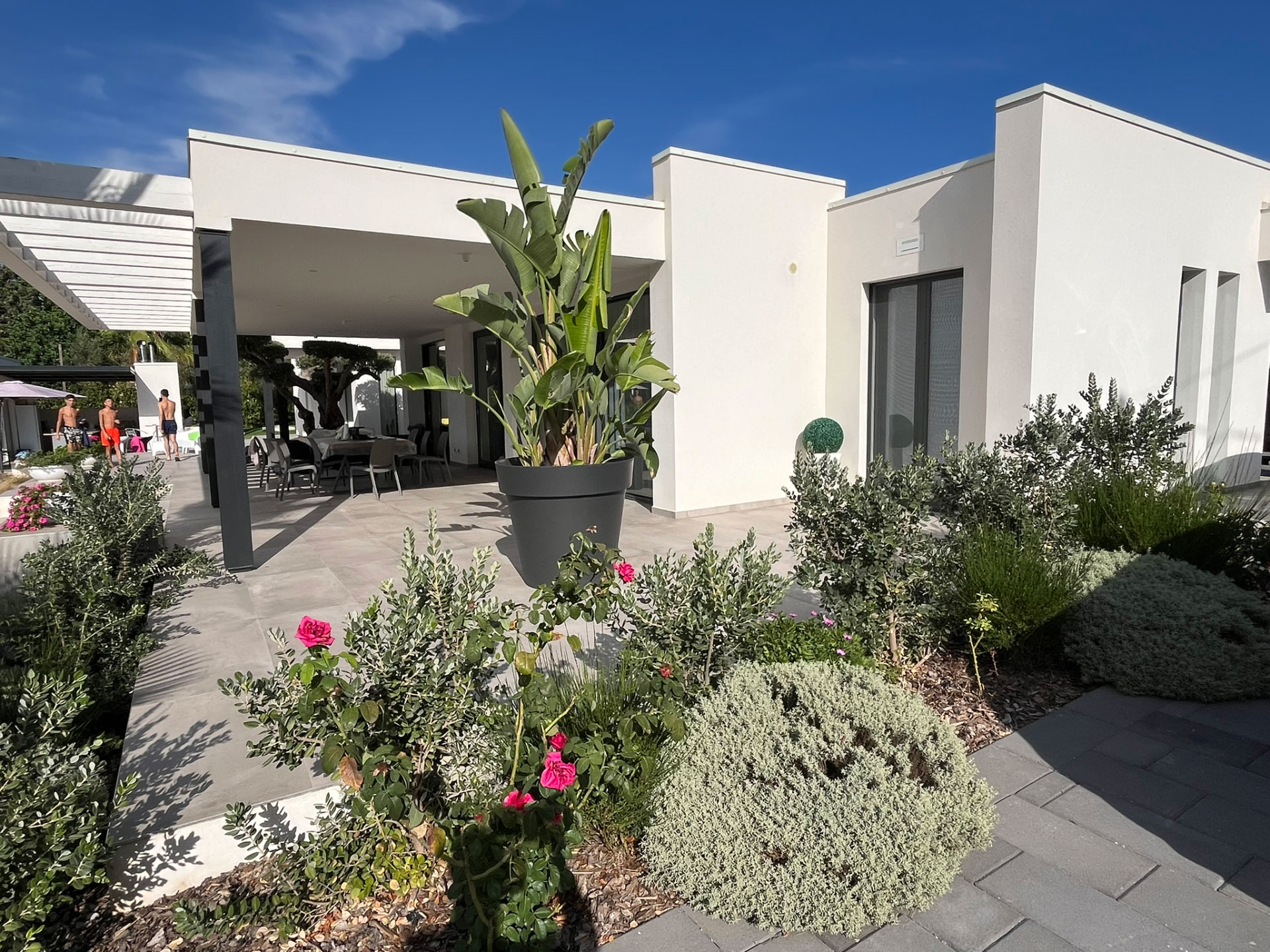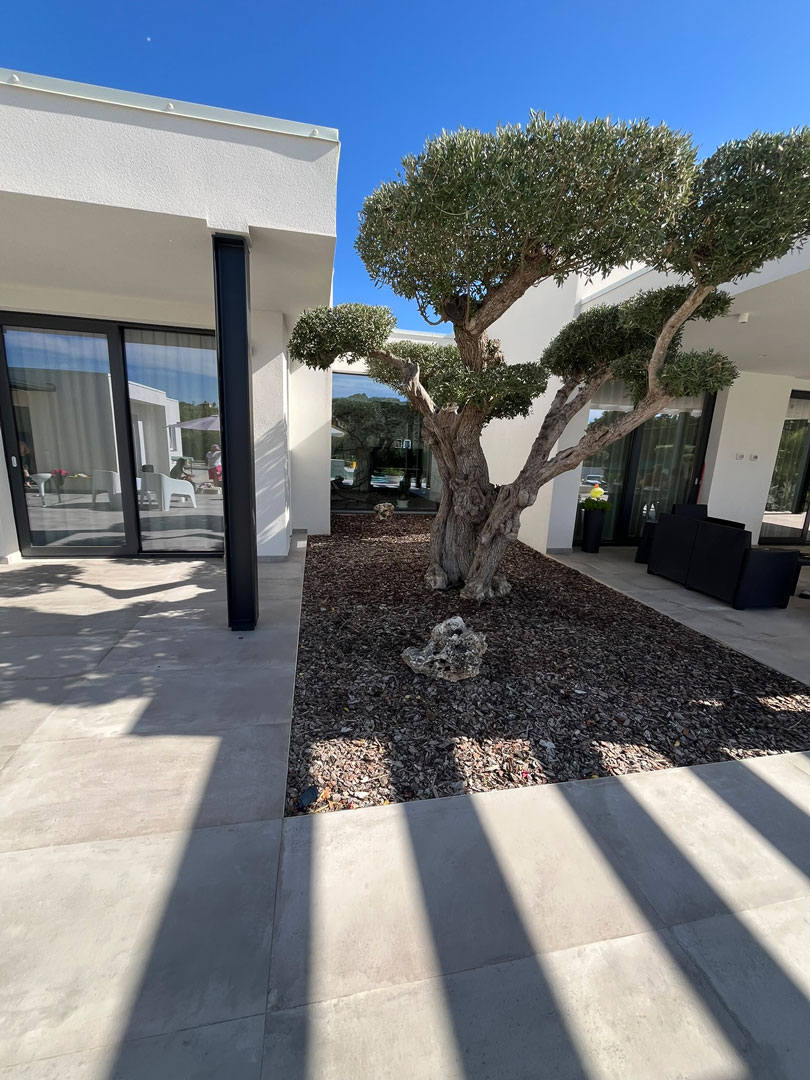 Il paesaggio mediterraneo entra in dialogo con l’architettura attraverso un’attenta selezione del verde: ulivi secolari, palme e piante ornamentali diventano elementi scultorei che arricchiscono il progetto, rafforzando la connessione con la natura.