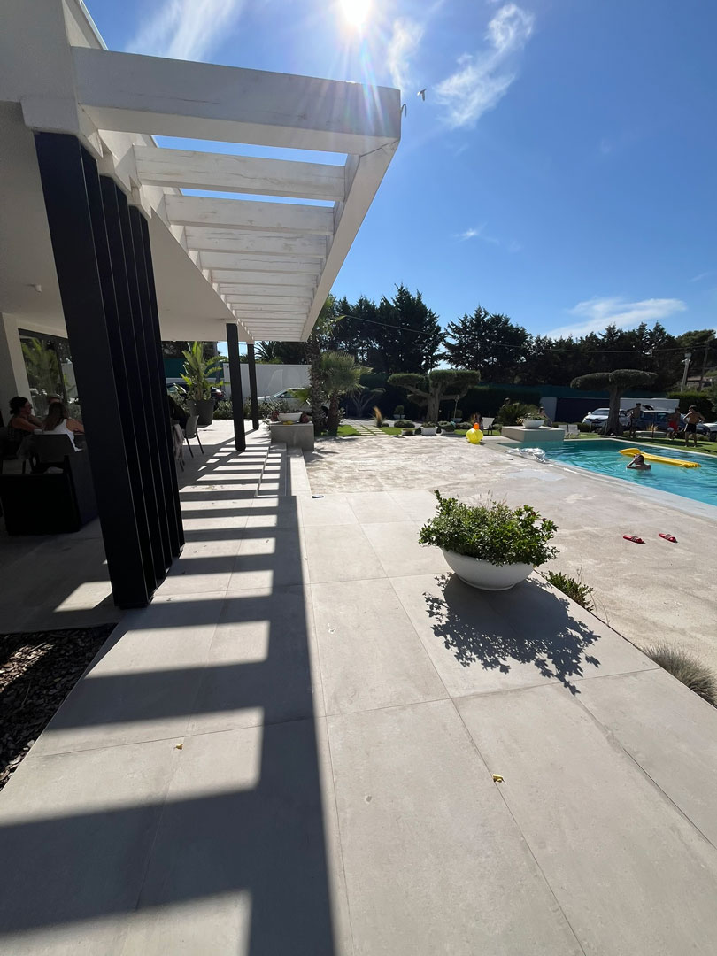 I pergolati in legno e acciaio disegnano ombre dinamiche che mutano durante il giorno, generando un gioco di luce e movimento che anima gli spazi esterni e ne sottolinea la geometria.
